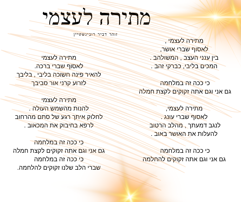 שמרו על הנפש , תהמהמו , שירו , זה מחזק את החוסן ואת הנפש . שמרו על עצמכם .